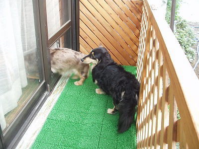 早速、ワンワン吠えながらサッシのワンコ用くぐり戸に